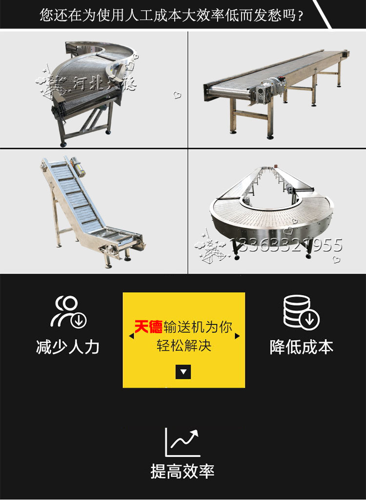 網帶輸送機結構形式: 水平直線輸送、提升爬坡輸送、轉彎輸送等多種形式,輸送帶上還可增設提升擋板、側擋板等附件,能滿足各種工藝要求。輸送機材質:有A3低碳鋼、201不銹鋼、304不銹鋼等。